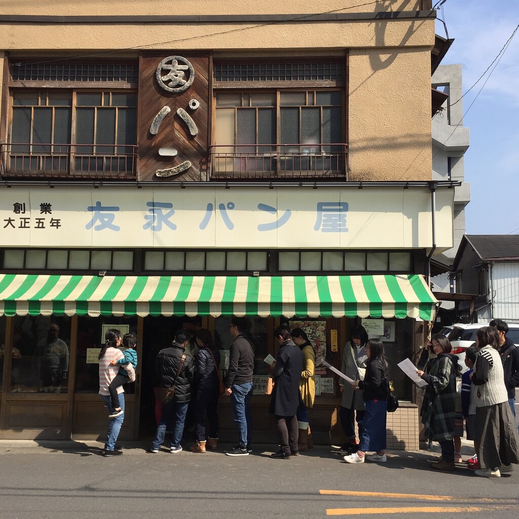 梅ヶ枝餅の実演販売見ながらソフトクリーム食べる人たち。